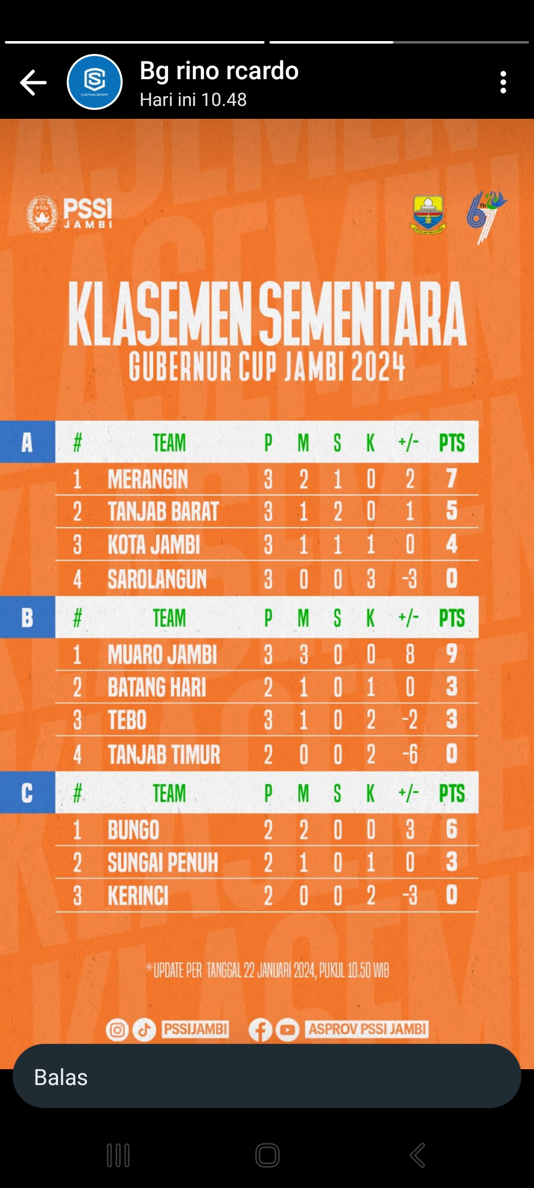 LMJ. Piala gubernur cup tahun 2024, sudah memasuki babak semifinal. Dimana Kabupaten yang berlaga di semifinal. Di grup A Kabupaten Merangin sebagai Juara grup, di grup B ada kabupaten Muaro Jambi sebagai juara grup dengan perolehan 9 point penuh, di grup C ada kabupaten Bungo, dan runner up terbaik ada tuan rumah yaitu Kabupaten Batanghari sebagai runner up terbaik,