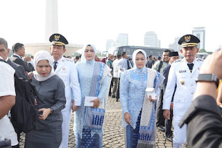 Sebelum memasuki gedung istana negara Bupati Kabupaten Muaro Jambi, Bambang Bayu Suseno bersama istri dan Wakil Bupati Junaidi H. Mahir dan Istri terlihat melakukan poto bersama di depan halaman Monumen Nasional.